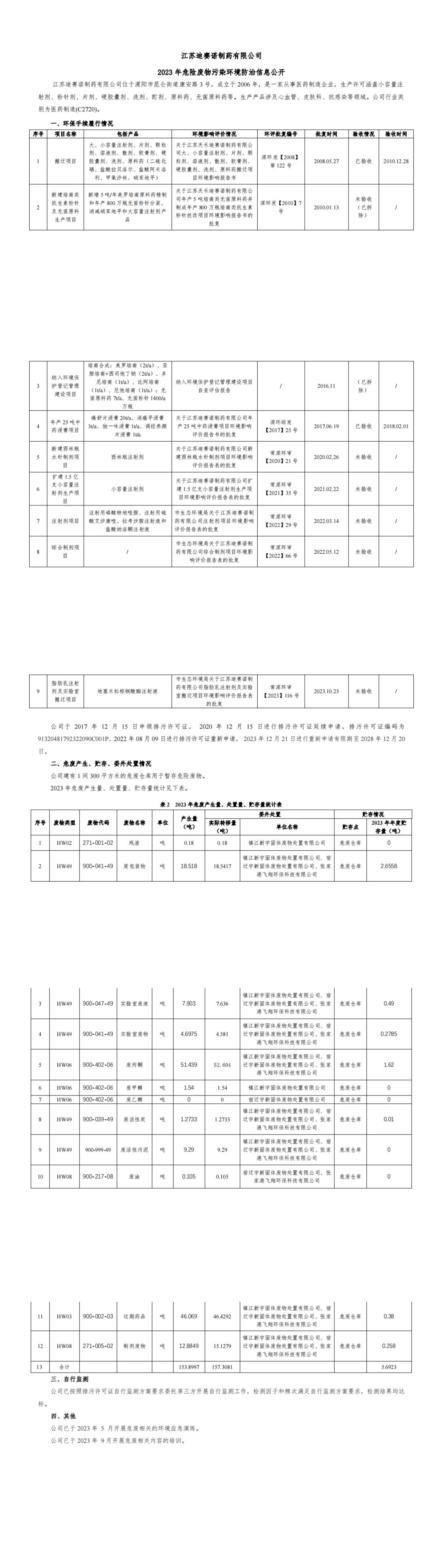 乐玩体育 2023 年危险废物污染环境防治信息公开